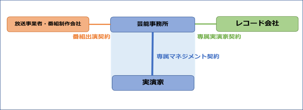 芸能事務所と実演家の契約の内容は様々であり、その法的性質も業務提携契約や業務委託契約など様々なものがあるが、その呼称としても専属実演家契約や専属マネジメント契約などと呼ばれるものがある(以下「専属マネジメント契約」という。)。一般的な専属マネジメント契約において、芸能事務所は、実演家に対し、レッスンによる育成やスケジュール管理等の役務を提供するとともに、必要なプロモーション活動等多方面にわたる広範なプロダクション業務を行い、これらに掛かる費用やリスクを負担する一方で、放送事業者又は番組制作会社(以下「放送事業者等」という。)から実演家による実演の対価を受け取り、その一部等を実演家に報酬として支払うこととすることにより、業務を継続することが可能となる。一方、実演家は、契約している芸能事務所のみと取引をしなければならないという専属義務や、芸能事務所の取引先である放送事業者等から提供を受けた場などにおいて実演する義務を負い、その対価として芸能事務所から報酬を受け取る。