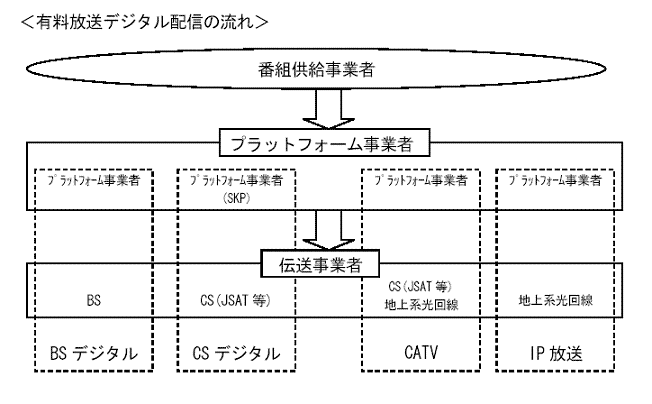 プラットフォーム事業者ごとに伝送ルートは異なるが,当事会社であるSKPは,JSATを通してコンテンツを配信している。