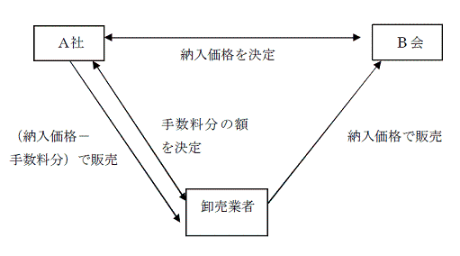 (2) 相談の場合においては,A社と卸売業者,卸売業者とB会との間でそれぞれ取引が成立するものであり,A社は,A社とB会との間で決定した価格でB会に販売するよう卸売業者に指示することとなる。