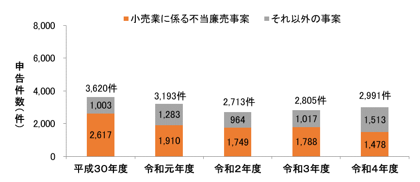 令和4年度において、独占禁止法の規定に違反すると考えられる事実について、公正取引委員会に寄せられた報告(申告)の件数は、2,991件であった。