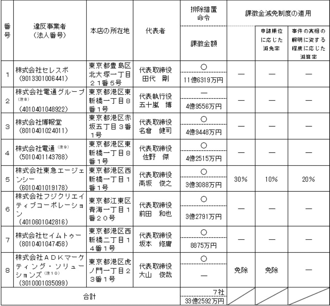(注12)表中「排除措置命令」欄の「○」は、その事業者が排除措置命令の対象事業者であることを示している。