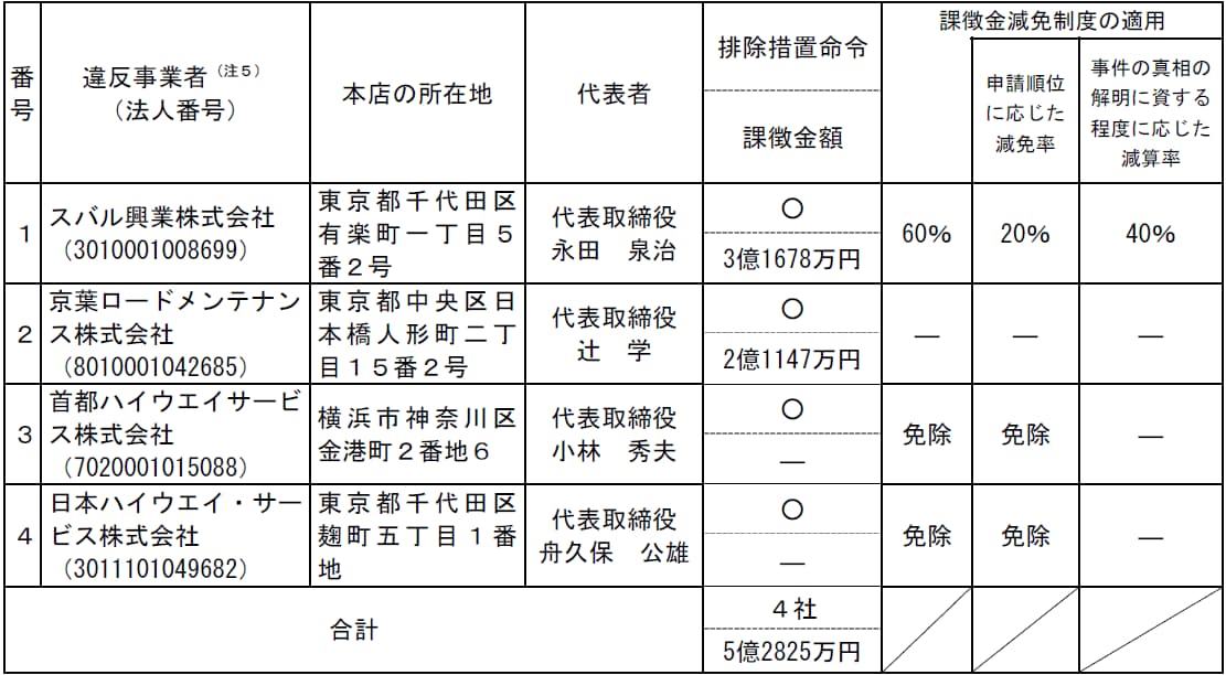 (注5)排除措置命令の名宛人である番号1から4の4社以外の特定の1社(以下「名宛人以外の1社」という。)は、違反事業者であるものの、平成30年9月5日以降、後記2の合意に基づき受注すべき者(以下「受注予定者」という。)を決定し、受注予定者が受注できるようにする行為を行っていない。同日から独占禁止法第7条第2項ただし書き及び同法第7条の8第6項に規定する期間(7年)が経過しているため、名宛人以外の1社は排除措置命令及び課徴金納付命令の対象とならない。