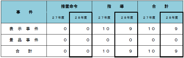 平成28年度における景品表示法の事件処理件数は,指導が9件であった(平成28年度の主要な指導事件は,別紙参照)。