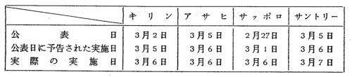 | 価格引上げは,サッポロ(平成2年2月27日),キリン(同年3月2日), アサヒ(同年3月5日),サントリー(同年3月5日)の順で公表された。 4社の価格引上げの公表日,公表日に予告された実施日及び実際の実施 日は,下表のとおりである。 ![]() その内容を対抗関係にあると認められる製品ごとに見ると,生産者価格, メーカー希望卸売価格(以下「希望卸売価格」という。)及びメーカー希望 小売価格(以下「希望小売価格」という。)の引上げ額及び新価格は,4社 とも一部例外を除き,同一となっている。 4社のビールの主要製品の希望小売価格について新価格並びに引上げ額 及び率を示すと,次表のとおりである。