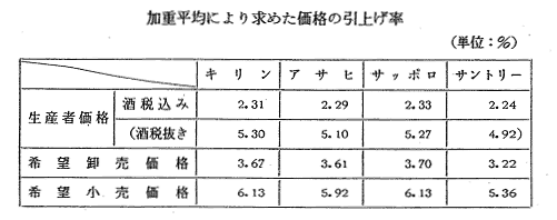 4社のビール全製品について生産者価格,希望卸売価格及び希望小売価 格の引上げ率を加重平均により求めると,次表のとおりである。