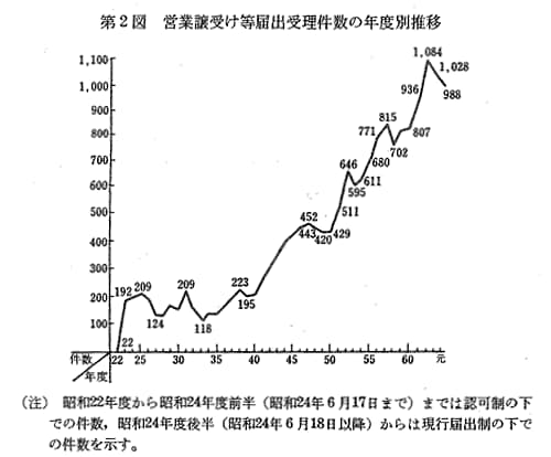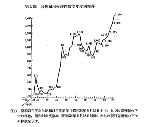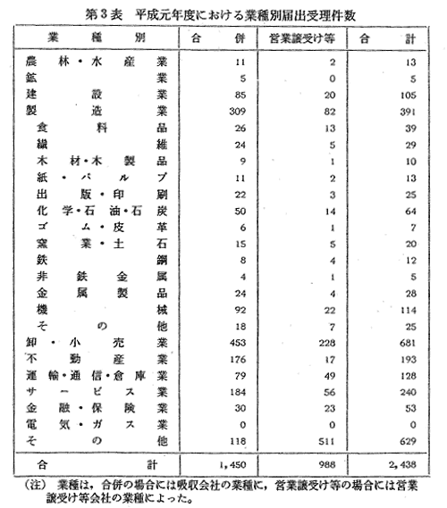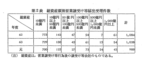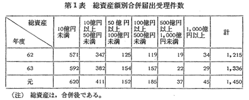| 合併の届出受理件数は,昭和47年度の1,184件をピークとして,その後は 減少傾向にあったが,昭和55年度から再び増加傾向に転じ,本年度におい ては1,450件と昭和63年度に続き史上最高となった(第1図)。 また,営業譲受け等の届出受理件数は,昭和40年度から増加傾向を示し てきたが,昭和62年度の1,084件をピークとして,その後は減少傾向にあ ![]() る(第2図)。 本年度に届出を受理した合併・営業譲受け等を総資産額別,業種別にみ ると,次のとおりである(第1表,第2表,第3表。なお,合併・営業譲 受け等についての詳細な統計については,付属資料3-3以下参照)。