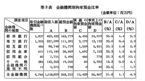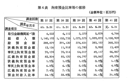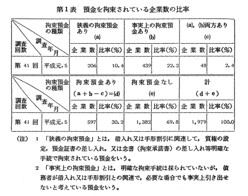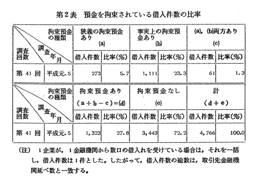 | 当委員会は,昭和38年4月,金融機関の行う歩積・両建てなどのいわゆ る拘束預金について,これが金融機関の取引上の優越した地位の濫用行為 (独占禁止法第2条第9項第5号,一般指定第14項)に該当する疑いがある として金融機関に対し警告を行い,以後その自粛状況を監視し, 併せて, これらの行為を規制する資料とするための実態調査を行ってきた。 本年度は,例年のとおり,全国に所在する中小企業(中小企業基本法の 定義による。)の中から,製造業,建設業,卸売業,小売業及びサービス 業の5業種について任意抽出した4,000社について,第41回調査(平成元 年5月)を実施した。4,000社のうち,回答のあったものは,1,979社で あった。 ![]() ![]()