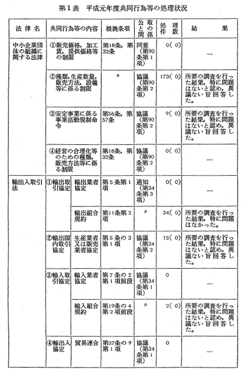 | 本年度において,特別法に基づき主務大臣から当委員会に対し同意を求 め,又は協議,通知をしてきた共同行為等の処理状況は第1表のとおりで あり,このうち主な特別法に基づく共同行為等の動向は,次のとおりであ る。 なお,肥料価格安定臨時措置法,内航海運組合法,環境衛生関係営業の 運営の適正化に関する法律,砂糖の価格安定等に関する法律,石炭鉱業合 理臨時措置法,卸売市場法,港湾運送事業法,酒税の保全及び酒類業組合 等に関する法律,真珠養殖等調整暫定措置法及び果樹農業振興特別措置法 に基づく共同行為に関する同意,協議等は1件もなかった(第1表)。 ![]()