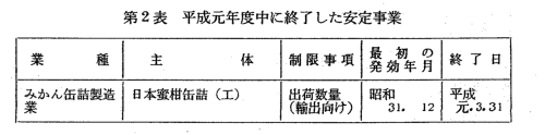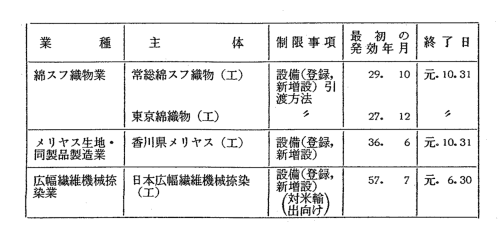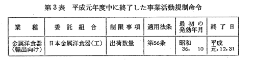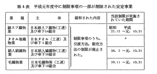 | 本年度において,中小企業団体の組織に関する法律に基づく共同行為の うち,終了したものは安定事業5件であり,新たに設定されたものはな かった(第2表)。 本年度末現在における同法に基づく共同行為の件数は11業種174件(前 年度末は13業種179件)であり,すべて安定事業であって,合理化事業は 行われていない。なお,このうち日本輸出絹人繊織物機械染色工業組合の 安定事業が,本年度末限りで終了することとなっている。 また,本年度において,安定事業に係る事業活動規制命令が1件終了 し,新たに設定されたものはなかった(第3表)。本年度末現在発動され ている事業活動規制命令は9件である。 ![]() ![]() ![]() 本年度において,制限事項の一部を削除する,安定事業の緩和が行われ た(第4表)。 なお,同事業に係る事業活動規制命令については,制限事項の緩和は行 われなかった。