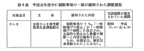 | 漁業生産調整組合法に基づき漁業生産調整組合が共同行為を行う場合に おいて,農林水産大臣がその認可をしようとするときは,当委員会に協議 しなければならないこととなっている。 本年度において協議を受けたものは,全国さんま棒受網漁業生産調整組 合が実施している漁船の登録,臨時休漁,陸揚数量の制限及び一時陸揚げ の制限に係る調整規程の期間の延長並びに北部太平洋海区漁業生産調整組 合が実施している漁船の登録, 陸揚げの制限,臨時休漁及び投網の制限に 係る調整規程の期間の延長についての2件である。 なお,全国さんま棒受網漁業生産調整組合の調整規程については, 制限 事項の緩和が行われている(第6表)。 これに対し,当委員会は,所要の調査を行った結果,特に問題ないと認 め,異議ない旨回答した。 本年度末現在における同法に基づく調整規程の件数は3件である。