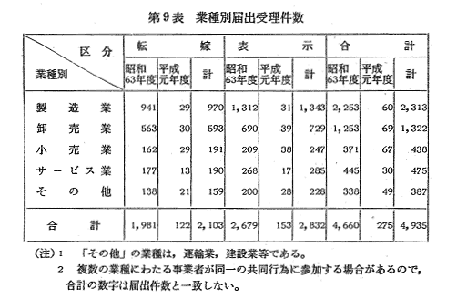 | 消費税法施行後(昭和63年12月30日)から本年度末(平成2年3月31 日)までの届出件数は「転嫁カルテル」が2,049件,「表示カルテル」が ![]() 2,539件,合計4,588件であった。 このうち本年度における届出件数は,昨年度に比べて大きく減少してお り,「転嫁カルテル」が121件,「表示カルテル」が140件,合計261件で あった。なお,これらの届出はほとんど年度当初に行われたものである。 |