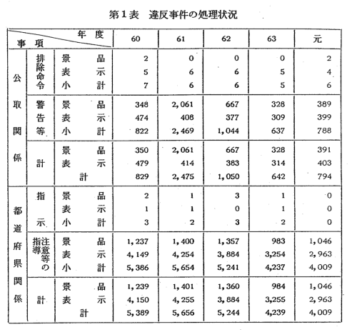 | 本年度において,都道府県知事が景品表示法第9条の2の規定に基づい て行った指示件数は皆無であった。また,注意等の指導件数は4,009件(景 品1,046件,表示2,963件)となっており,このうち過大な景品付販売関係 では,懸賞制限告示違反及び消費者景品制限告示違反でほとんどを占め, 不当表示関係では,価格表示に関する事案が相当数を占めている(第1 表〉。 |
