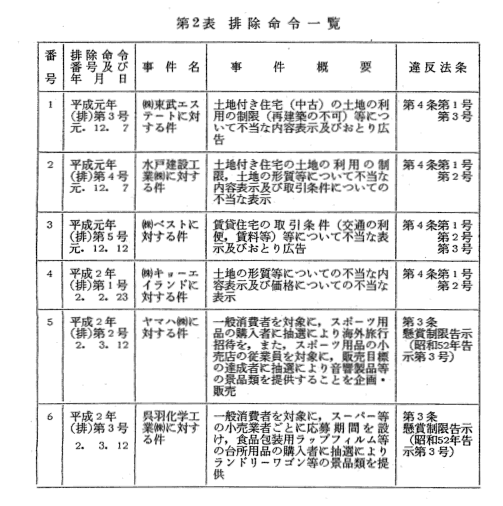 | 本年度における排除命令は,不当な表示に関するもの4件,過大な景品 類の提供に関するもの2件である(第2表)。その内訳は,不動産業者に ![]() よる土地付き住宅の土地の利用の制限等についての内容表示及びおとり広 告に関する違反事件が4件,食品包装用ラップフィルム製造事業者及びス ポーツ用品製造事業者による制限額を超える過大な景品類の提供に関する 違反事件がそれぞれ1件となっている。 |