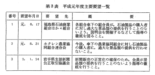 | 当委員会は,公正取引協議会(規約の運用を目的として, 規約に参加す る事業者及び事業者団体により結成されている。)に対し,規約の適正な 運用を図るため,協議会の行う事業の遂行,事案の処理等について指導を 行っている。 本年度においても,協議会が行った規約の実施状況調査,商品の試買検 査会, 審査会等について指導を行うとともに,各都道府県の行った規約対 象商品の試買査の結果により, 協議会に対し,問題点についての処理, 改善等について指導を行った。 さらに,景品規約の内容が現在の経済実態と適合しているかどうか検討 を行うよう,引き続き協議会に対し指導を行った。 また, 公正取引協議会は,規約の実施上必要な事項について,規約の定 めるところにより,施行規則,運用基準等を設定し,規約の円滑な運用を 期しているが,これら施行規則等の設定,変更に当たっても,当委員会は 積極的に指導を行っている。本年度における規約の施行規則の設定,変更 は,設定が4件,変更が10件,計14件であった。 なお, 各公正取引協議会の業務の推進及び連携,協力を緊密にし,規約 の適正かつ円滑な施行を図るため,社団法人全国公正取引協議会連合会 (会長 石原 俊)に対し,①規約遵守状況実態調査,②公正取引協議会 等の会員に対する研修業務及び③規約制度等の普及,啓発業務についてそ れぞれ調査等を委託した。 また,平成2年1月31日に公正取引協議会事務局長会議を開催し,共通 の問題点の検討,業務処理の改善の研究等を行った。 |