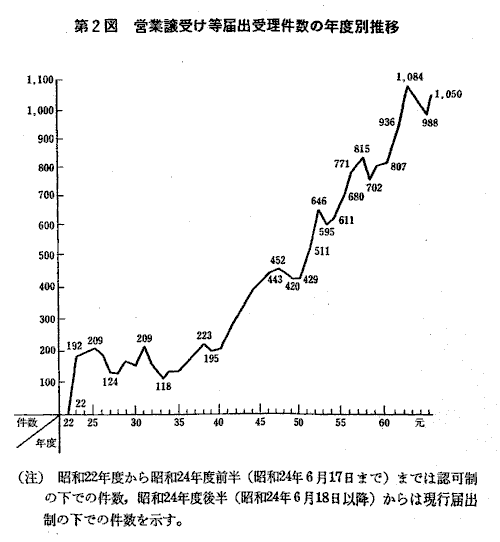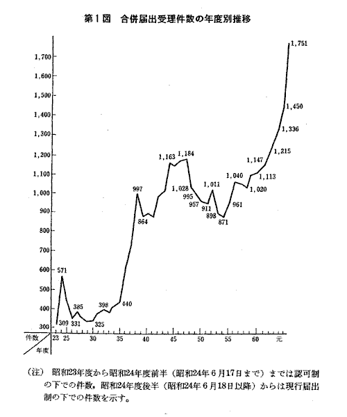 | 合併の届出受理件数は,昭和47年度の1,184件をピークとして,その後 は減少傾向にあったが,昭和55年度から再び増加傾向に転じ,本年度にお いては1,751件と平成元年度に続き史上最高となった(第1図)。 また,営業譲受け等の届出受理件数は,昭和40年度から増加傾向を示し てきたが,昭和62年度の1,084件をピークとして,その後は減少傾向にあっ たが,本年度は,3年ぶりに増加した(第2図)。 ![]()