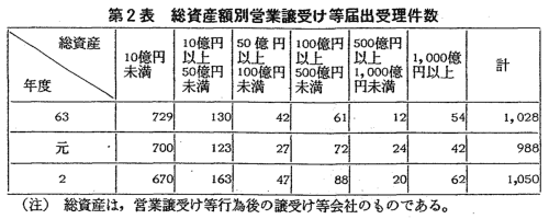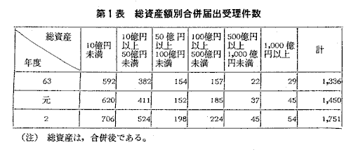本年度に届出を受理した合併・営業譲受け等を総資産額別,業種別に見 ると,次のとおりである(第1表,第2表,第3表。なお,合併・営業譲 受け等について詳細な統計については,附属資料4-3以下参照)。