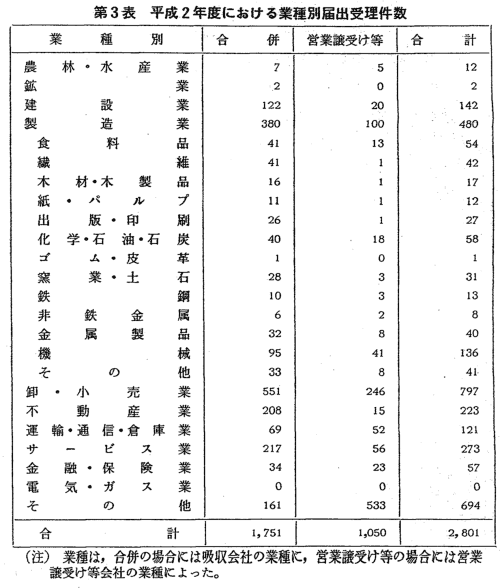 事例はなかった。 次に本年度の合併・営業譲受け等の届出を形態別に見ると,合併につい ては,1,748件が吸収合併,3件が新設合併であった。営業譲受け等につ いては,1,028件が独占禁止法第16条第1号(営業の譲受け)又は第2号(営 業上の固定資産の譲受け),11件が同条第3号(営業の貸借),11件が同条 第4号(経営の受任)の規定に該当するものであった。なお,同条第5号 (営業の損益共通契約)の規定に該当するものはなかった。 |
