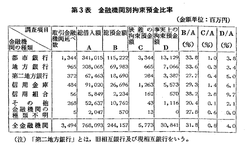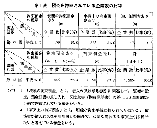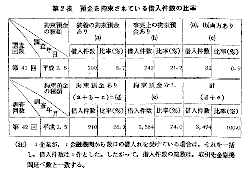 | 当委員会は,昭和38年4月,金融機関の行う歩積・両建てなどのいわゆ る拘束預金について,これが金融機関の取引上の優越した地位の濫用行為 (独占禁止法第2条第9項第5号,一般指定第14項)に該当する疑いがある として金融機関に対し警告を行い,以後その自粛状況を監視し,併せてこ れらの行為を規制する資料とするための実態調査を行ってきた。 本年度は,例年のとおり,全国に所在する中小企業(中小企業基本法の 定義による。)の中から,製造業,建設業,卸売業,小売業及びサービス 業の5業種について任意抽出した4,000社について,第42回調査(平成2 年5月)を実施した。4,000社のうち,回答のあったものは,1,585社で あった。 ![]() ![]()