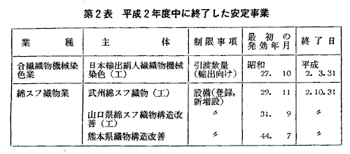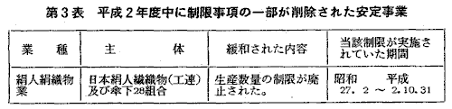 | 本年度において,中小企業団体の組織に関する法律に基づく共同行為の うち,終了したものは安定事業4件であり,新たに設定されたものはな かった(第2表)。 本年度末現在における同法に基づく共同行為の件数は10業種170件(前 年度末は11業種174件)であり,すべて安定事業であって,合理化事業は 行われていない。 また,本年度においては,安定事業に係る事業活動規制命令は終了した ものも,新たに設定されたものもなかった。本年度末現在発動されている 事業活動規制命令は9件である。 ![]() 本年度において,制限事項の一部を削除する,安定事業の緩和が行われ た(第3表)。