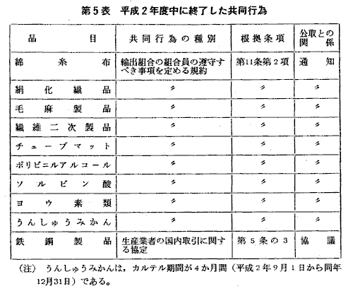 | 本年度において,輸出入取引法に基づき新規に設定された共同行為はな く,本年度中に終了した共同行為は10件(うち1件は,年度内に設定,廃 止されている。)であり,本年度末現在における同法に基づく共同行為の 件数は34件となっている(第5表)。 また,本年度において新規に定められたアウトサイダー規制命令はな く,本年度末現在におけるアウトサイダー規制命令の件数は10件となって いる。