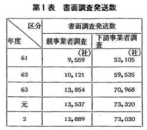 | 本年度においては,資本金3,000万円以上の主として製造業者11,889社 及びこれらと取引している下請事業者72,030社を対象に書面調査を行った (第1表)ほか,資本金1,000万円超3,000万円未満の製造業者1,000社に対 して書面調査を実施した。 |