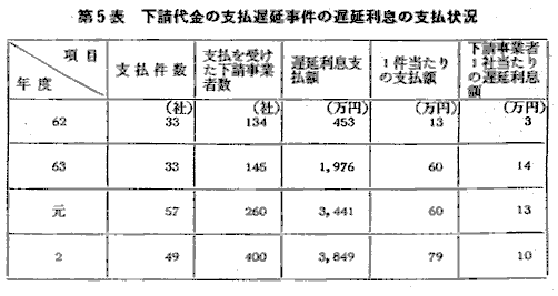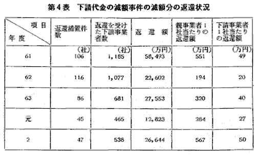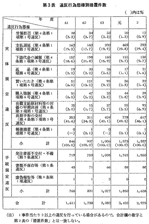 ![]() また,下請法の内容に係る違反では,手形期間が120日(繊維製品の場 合は90日)を超える長期手形等の割引困難な手形の交付(第4条第2項第 2号違反)が617件,下請代金の支払遅延(第4条第1項第2号違反)が 393件,下請代金の減額(第4条第1項第3号違反)が130件,買いたたき (第4条第1項第5号違反)が32件となっており,それぞれ前年度より減 少している(第3表)。 なお,下請代金の減額事件について,本年度中に,親事業者47社が総額 2億6,644万円を538社の下請事業者に自主的に返還した(第4表)。また, 支払遅延が認められた事件について,親事業者49社が総額3,849万円の遅 延利息を400社の下請事業者に支払った(第5表)。 |