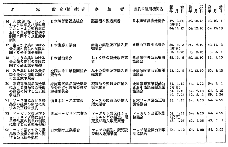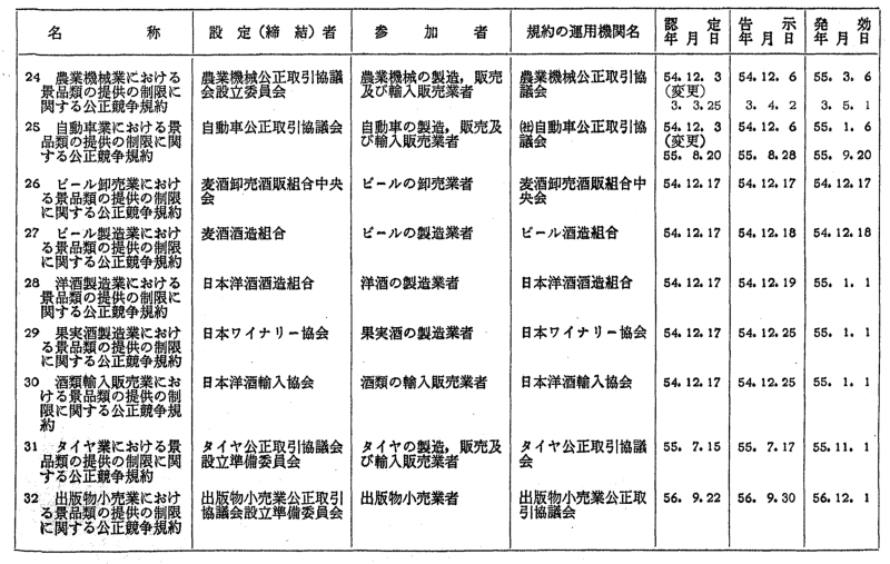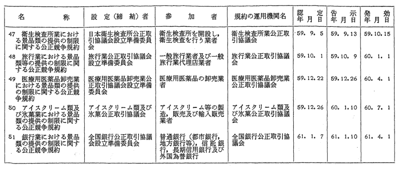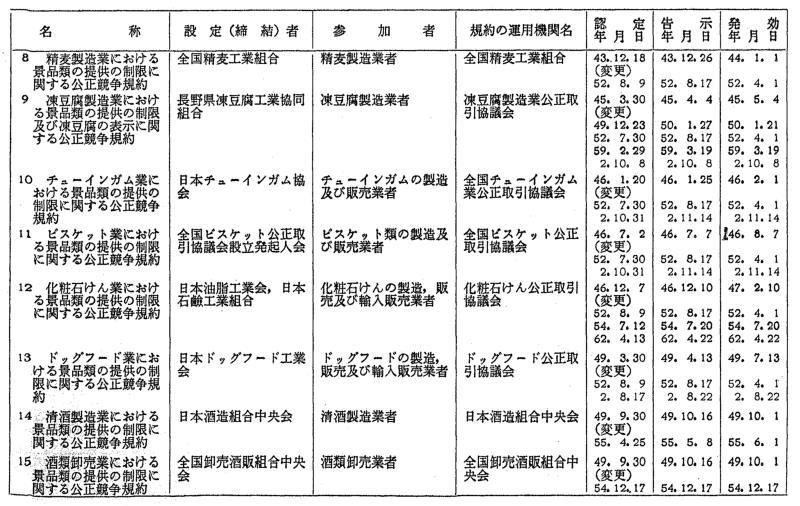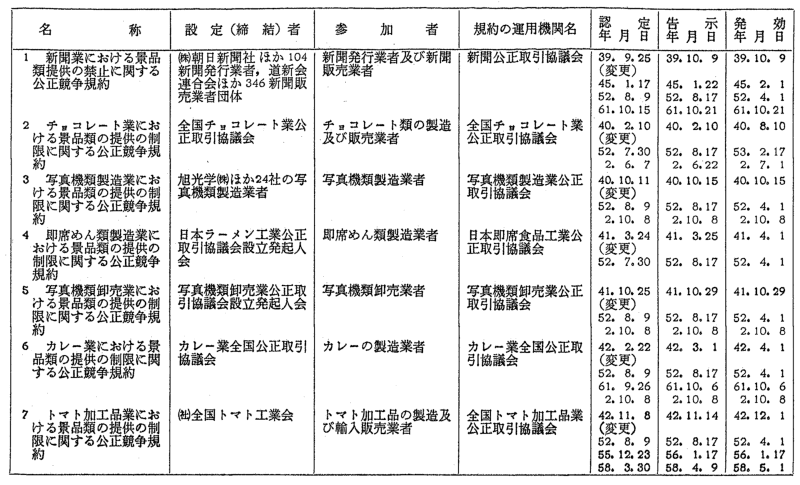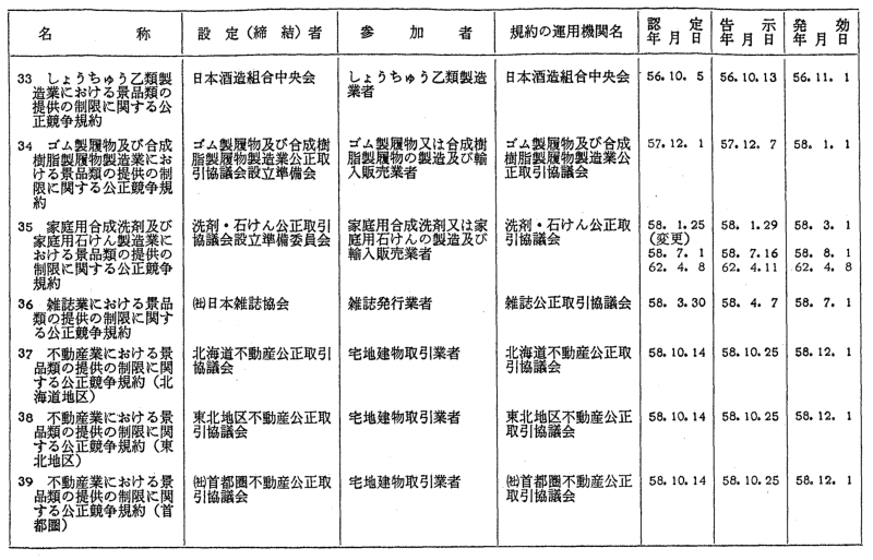 景品関係公正競争規約一覧