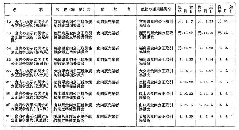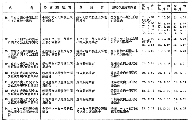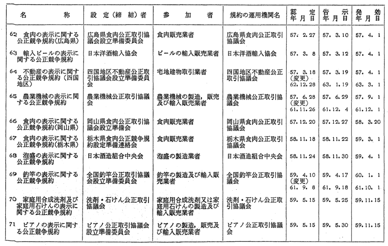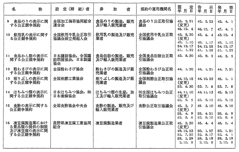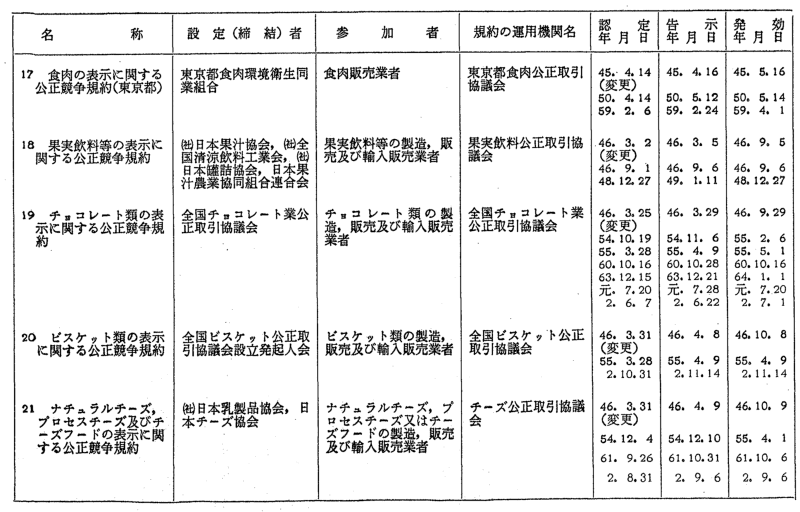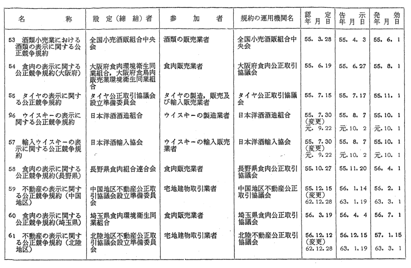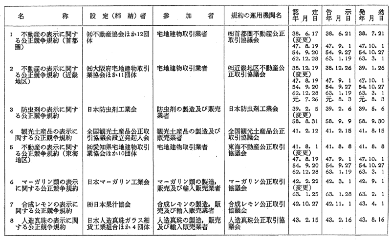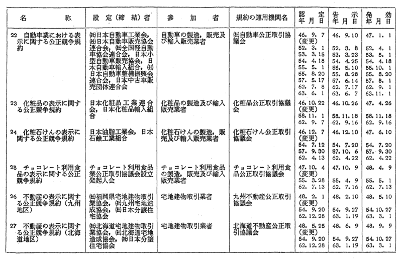 表示関係公正競争規約一覧