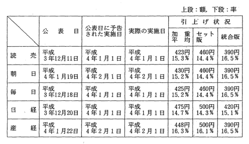購読料引上げは,読売(平成3年12月11日),毎日(同年12月18日),日