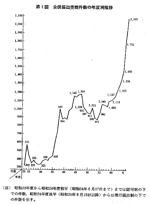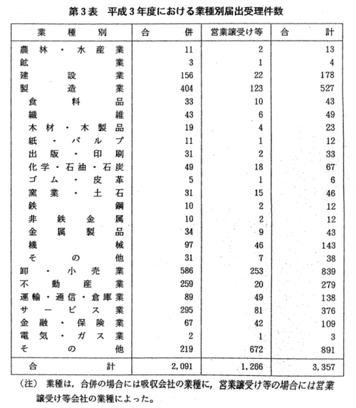 | 合併の届出受理件数は,昭和47年度の1,184件をピークとして,その後 は減少傾向にあったが,昭和55年度から再び増加傾向に転じ,本年度にお いては2,091件と平成2年度に続き過去最高となった(第1図)。 また,営業譲受け等の届出受理件数は,昭和40年度から増加傾向を示し ており,本年度においては,1,266件と過去最高となった(第2図)。 本年度に届出を受理した合併・営業譲受け等を総資産額別,業種別に見 ると,次のとおりである(第1表,第2表,第3表。なお,合併・営業譲 受け等についての詳細な統計については,附属資料4-3以下参照。