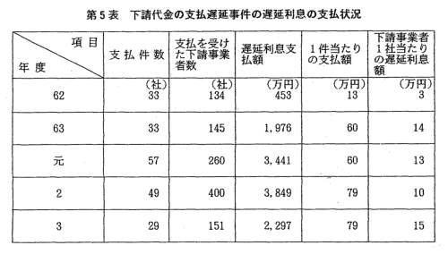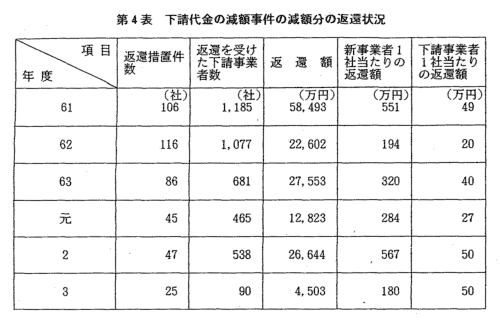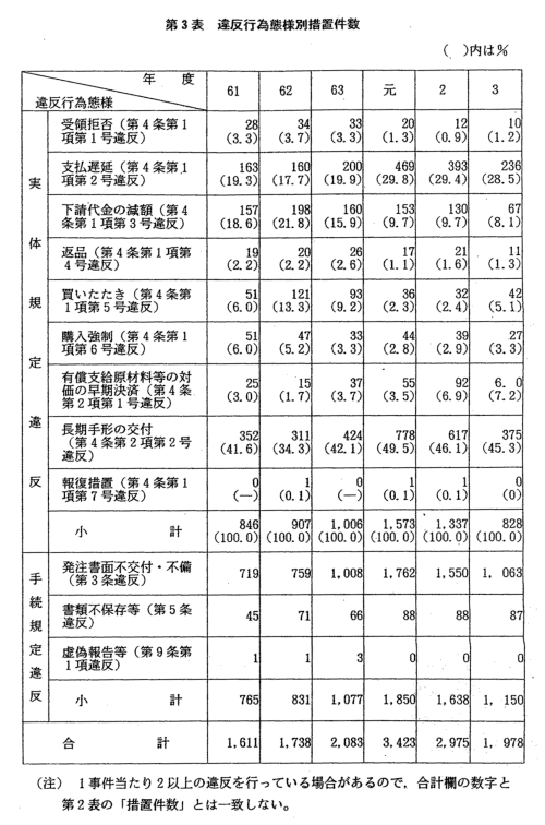 | 本年度において措置した下請法違反事件を違反行為態様別にみると,最 も多いのは,発注時に注文書を交付していない又は交付していても記載す べき事項が不備のもの(第3条違反)で1,063件となっており,前年度よ り減少している。 また,下請法の内容に係る違反では,手形期間が120日(繊維製品の場 合は90日)を超える長期手形等の割引困難な手形の交付(第4条第2項第 2号違反)が375件,下請代金の支払遅延(第4条第1頃第2号違反)が 236件,下請代金の減額(第4条第1項第3号違反)が67件,買いたたき (第4条第1項第5号違反)が42件となっており,買いたたきが前年度よ ![]() ![]() り増加しているが,その他については減少している(第3表)。 なお,下請代金の減額事件について,本年度中に,親事業者25社が総額 4,503万円を90社の下請事業者に自主的に返還した(第4表)。また,下請 代金の支払遅延が認められた事件について,親事業者29社が総額2,297万 円の遅延利息を151社の下請事業者に支払った(第5表)。 |