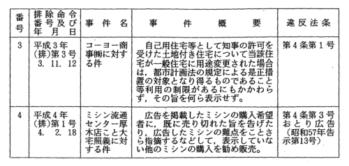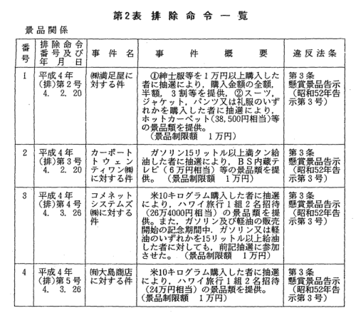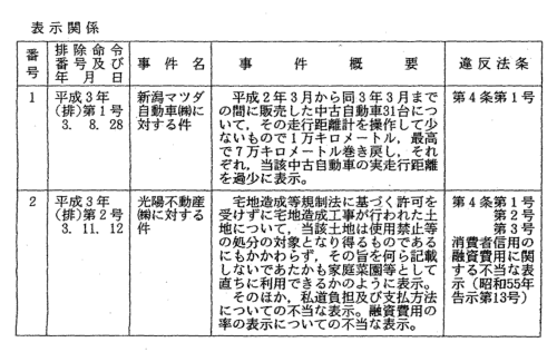 | 本年度における排除命令は,過大な景品類の提供に関するもの4件,不 当な表示に関するもの4件である(第2表)。その内訳は,紳士服,ガソ リン及び米穀の販売業者による過大な景品類の提供に関する違反事件が4 件,自動車販売業者による中古自動車の実走行距離の不当表示1件,不動 産業者による土地の利用に係る不当表示2件,ミシン販売業者によるミシ ンについてのおとり広告1件となっている。 ![]() ![]()