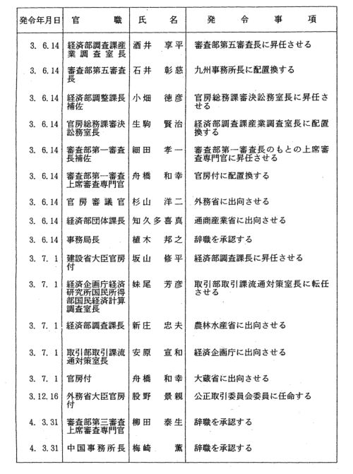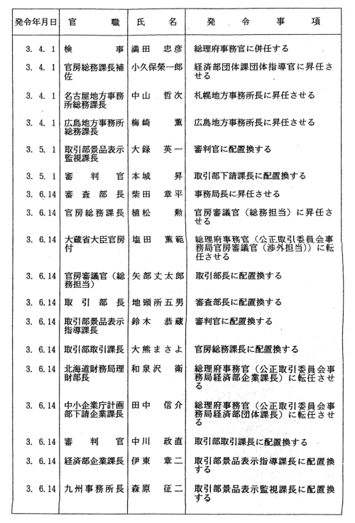 れた(公正取引委員会事務局組織規程の一部を改正する規則(平成3年