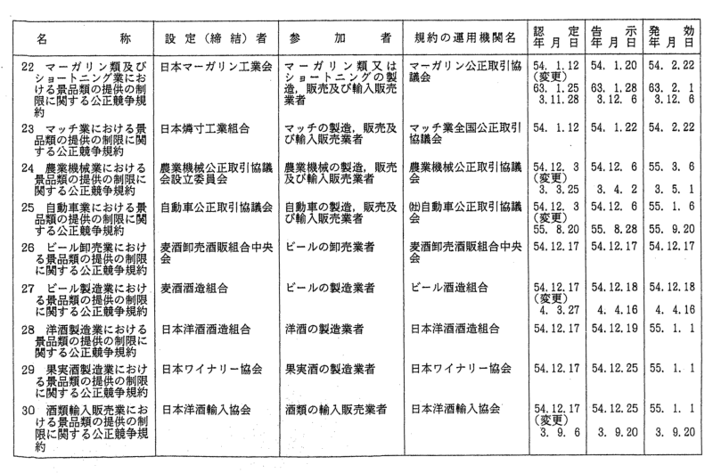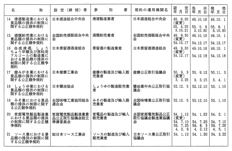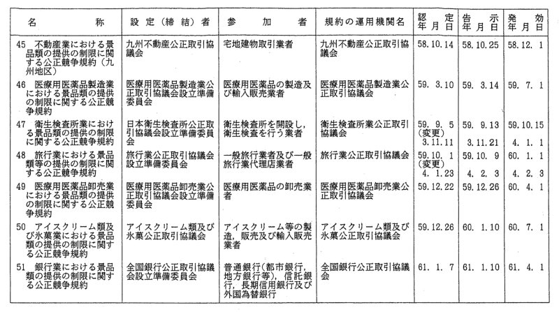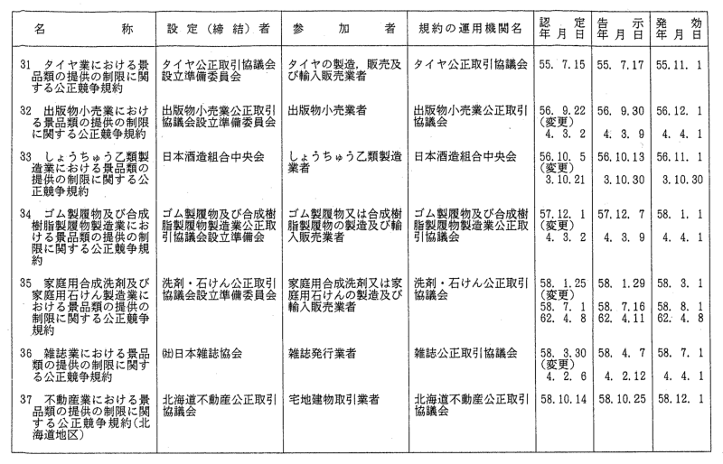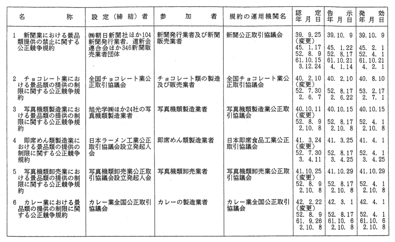 景品関係公正競争規約一覧