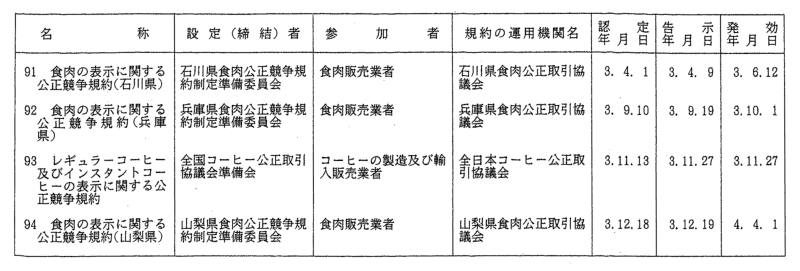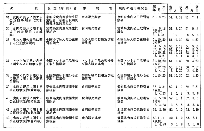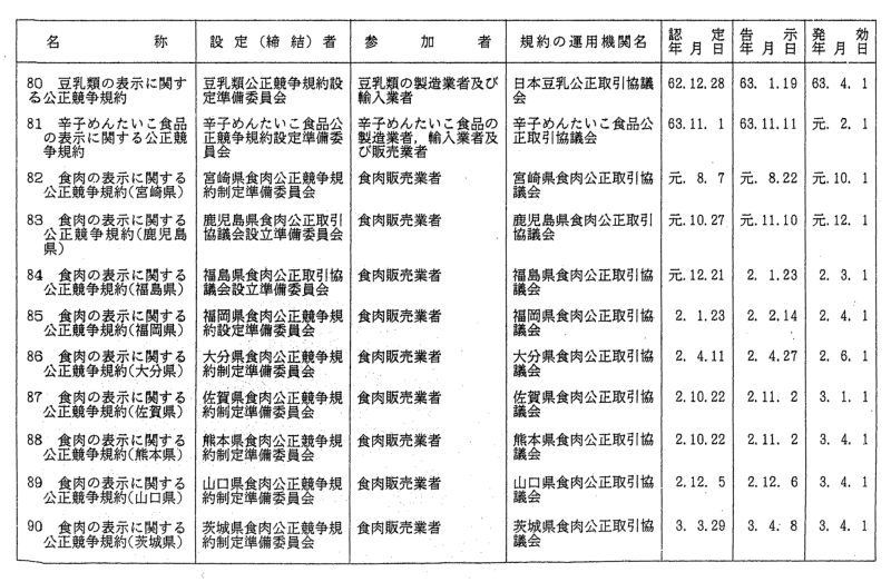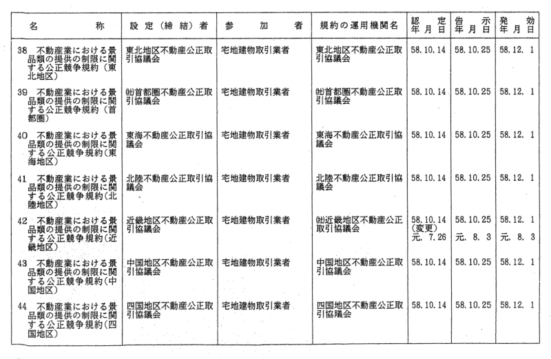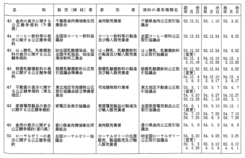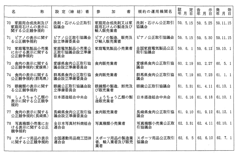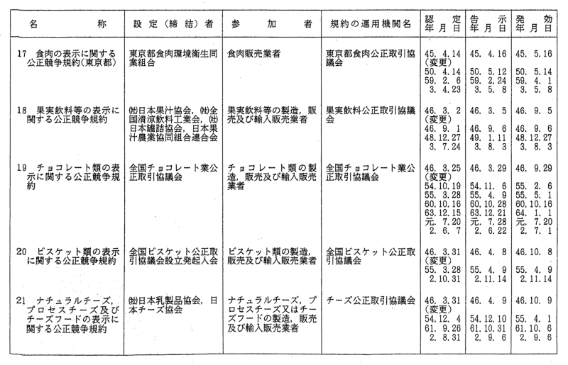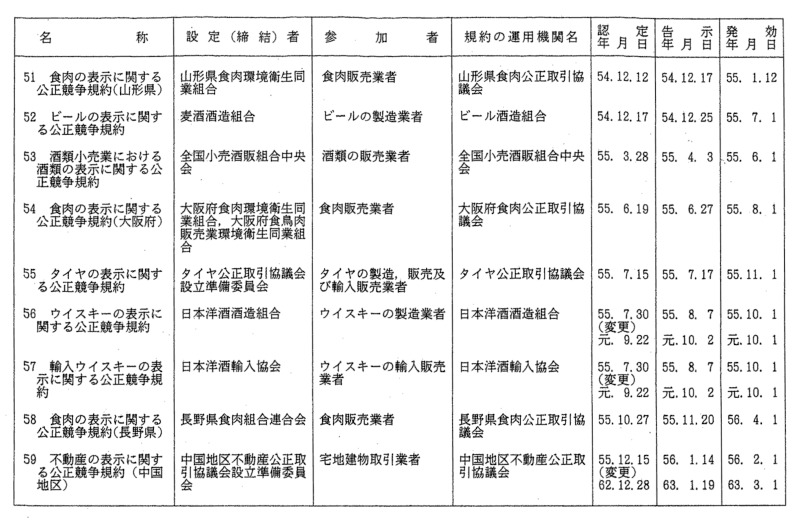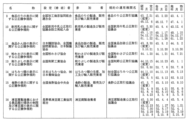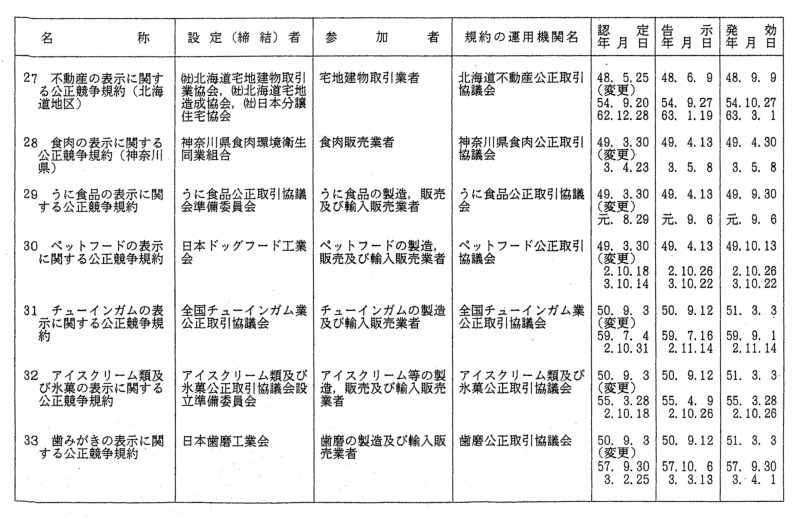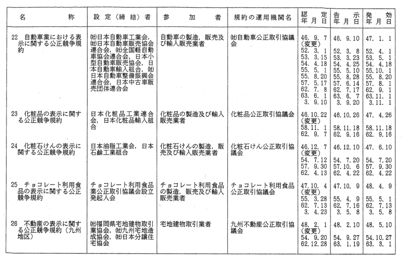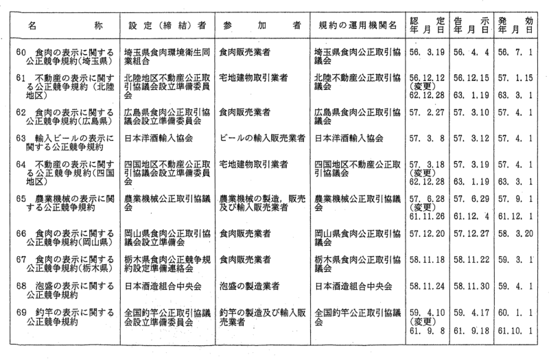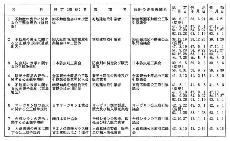 表示関係公正競争規約一覧