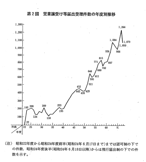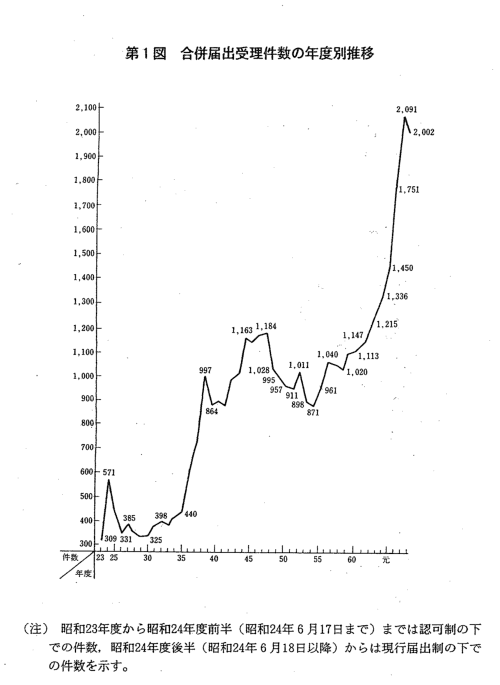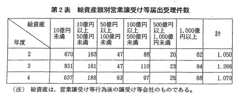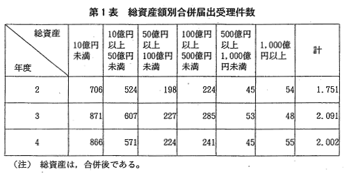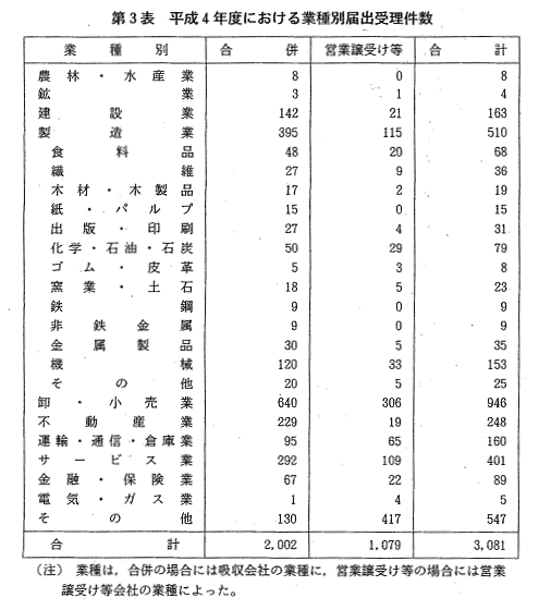| 合併の届出受理件数は,昭和47年度の1,184件をピークとして,その後 は減少傾向にあったが,昭和55年度から再び増加傾向に転じ,本年度にお いては2,002件と過去最高となった平成3年度に続く水準であった(第1 図)。 また,営業譲受け等の届出受理件数は,昭和40年度から増加傾向を示し ており,本年度においては,1,079件と平成3年度に比べやや減少した (第2図)。 本年度に届出を受理した合併・営業譲受け等を総資産額別,業種別に見 ると,次のとおりである(第1表,第2表,第3表。なお,合併・営業譲 受け等についての詳細な統計については,附属資料4-2以下参照)。