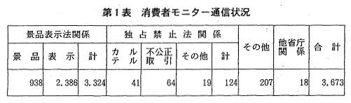 | 消費者モニターの仕事として,上記のアンケート調査のほか,消費者モ ニターが随時自由に意見及び情報を提供することがある。この自由通信 は,①独占禁止法,景品表示法の違反被疑事実の通報,②景品表示法に基 づいて設定された公正競争規約の遵守状況等についての情報提供,③その 他一般的な意見の提供等であり,本年度は合計3,673件の自由通信が寄せ られた(第1表)。   | ||||||||||||||||||