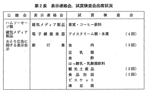 | 景品表示法に基づき公正競争規約を認定する際には,公聴会,表示連絡 会等を開催して各方面の意見を聴取することとしているが,消費者モニ ターを必要に応じてこれらの会合に出席させ,一般消費者の立場からの意 見を求めている。 本年度は,公聴会3件,表示連絡会3件及び試買検査会19件の会合に消 費者モニターが出席した(第2表)。   | ||||||||||||||||||