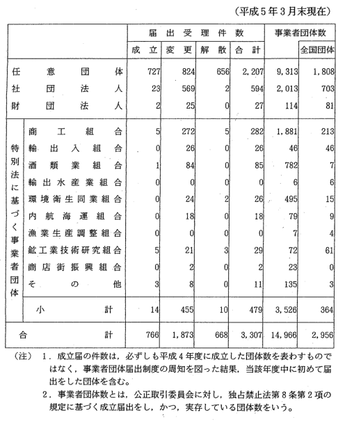根拠法別事業者団体届出受理件数及び事業者団体数