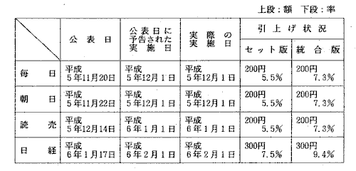 毎日,朝日, 読売及び日経の購読料引上げの公表日,公表日に予告さ