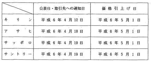 4社は,平成6年5月1日からビールの販売価格の引上げを実施した