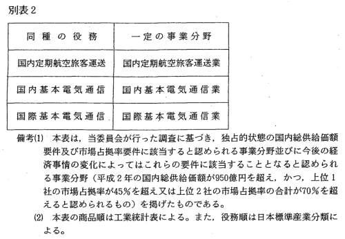 の事業分野が別表に掲載される一方,乗用車製造業,ピアノ製造業など9つ