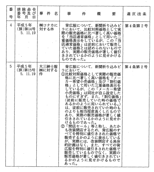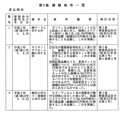 | 本年度における排除命令は,景品関係3件,表示関係5件の計8件であ る(第2表)。その内訳は,石油製品販売業者,プレハブ住宅販売業者及 ![]() ![]() ![]() び写真現像・焼付業者による過大な景品提供事件3件,エステティック業 者による痩身サービスに係る不当表示事件1件,紳士服販売業者による不 当な二重価格表示事件4件となっている。なお,上記プレハブ住宅販売業 者に対しては,景品類の価格に係る不当表示についても排除命令を行って いる。 |