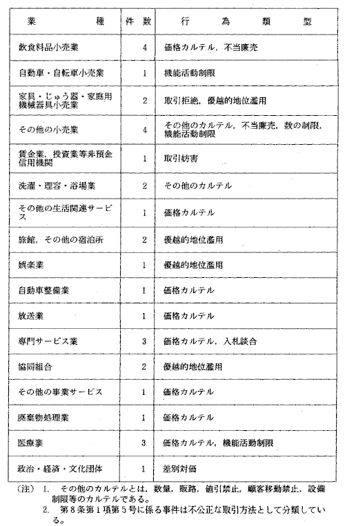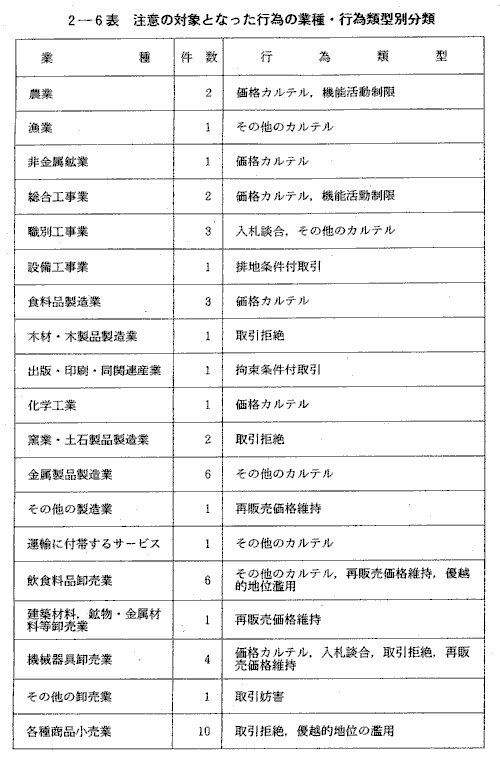 注意の対象となった行為の業種・行為類型別分類