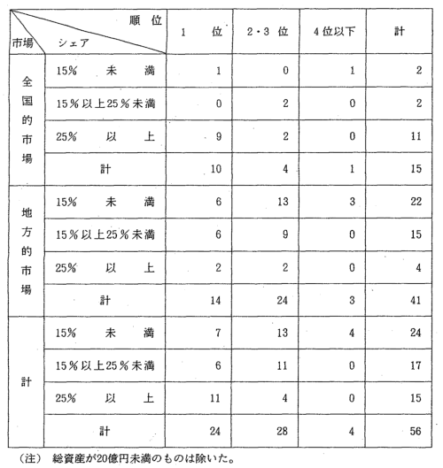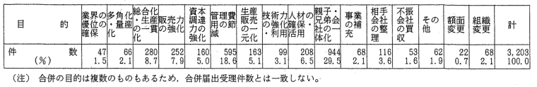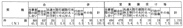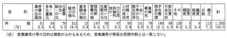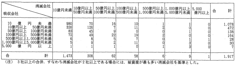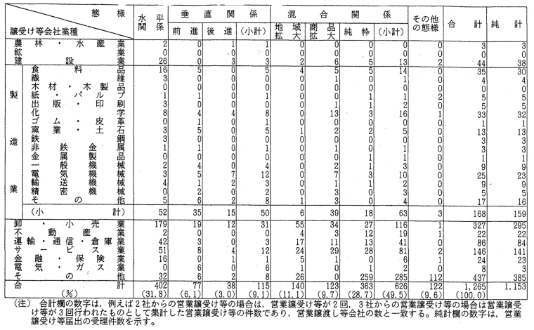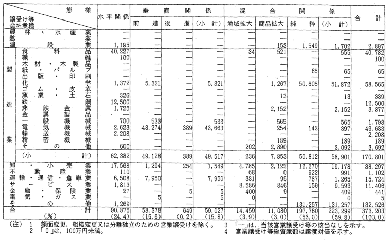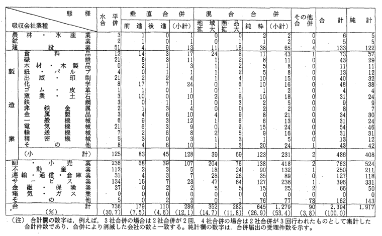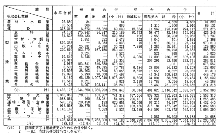 | (2) | 会社がどの業種に属するかは,合併時又は営業譲受け時における当該 会社の生産額,販売額のうち最大のものによった。事業を行っていない 会社についてはその他に分類した。 |