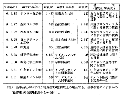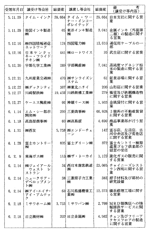 | (1) | この統計は,平成5年4月1日から平成6年3月31日までの間に,当 委員会が受理した会社の合併及び営業譲受け等の届出に関する諸指標を 取りまとめたものである。 |