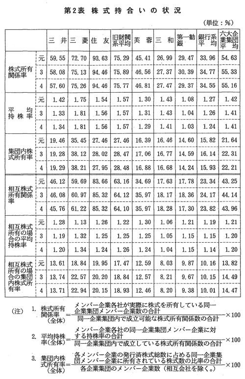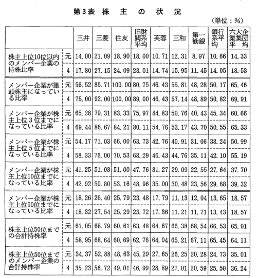 いない。また,平均持株率も銀行系企業集団に比べ旧財閥系企業集団が