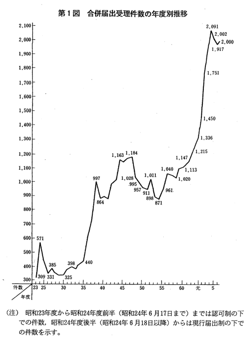 | 合併の届出受理件数は,昭和55年度から増加傾向を示し,平成3年度に おいて2,091件と過去最高となった後,平成4年度は2,002件,平成5年度 は1,917件と減少したが,本年度は2,000件と増加した(第1図)。