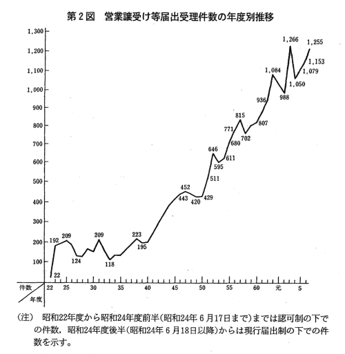 また,営業譲受け等の届出受理件数は,昭和40年度から増加傾向を示 し,平成3年度において1,266件と過去最高となった後,平成4年度は 1,079件と減少したが,平成5年度は1,153件となり,本年度は1,255件と なった(第2図)。 ![]() ![]() ![]()