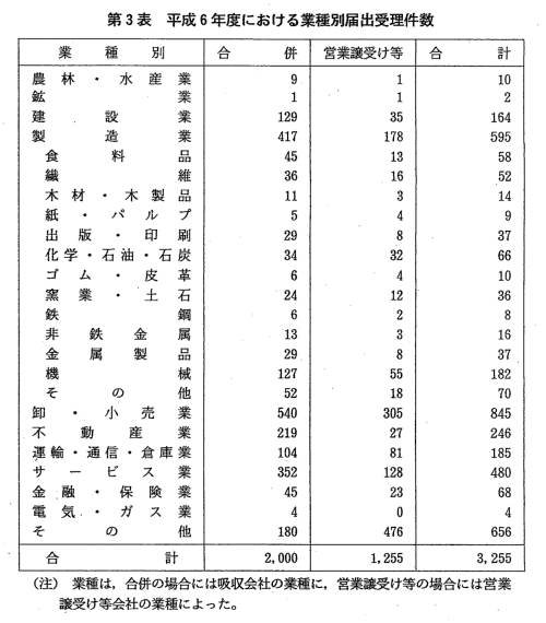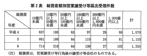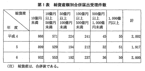 本年度に届出を受理した合併・営業談受け等を総資産額別,業種別,形 態別,様式別に見ると,次のとおりである(第1表,第2表,第3表。な お,合併・営業譲受け等についての詳細な統計については,付属資料4- 2以下参照。)